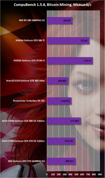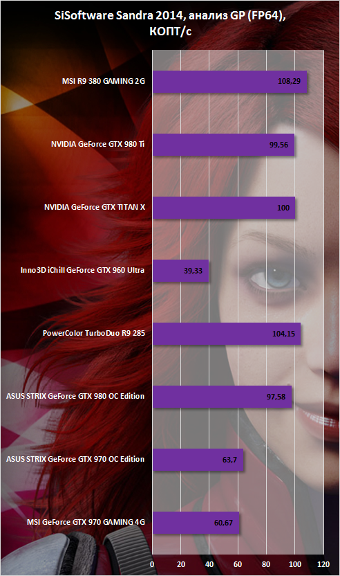 В приложениях, связанных с вычислениями, наблюдается та же тенденция. В большинстве тестов R9 380 GAMING 2G оказалась чуть впереди и Inno3D iChill GeForce GTX 960 Ultra, и PowerColor TurboDuo R9 285.