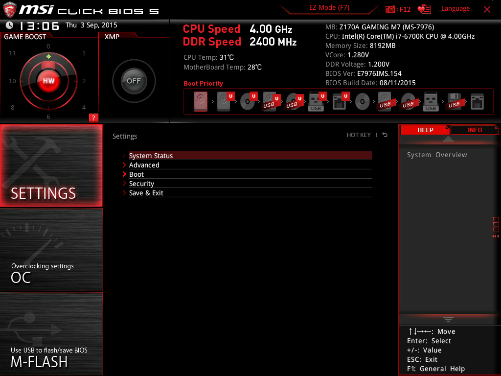 Материнская плата Z170A GAMING M7 получила новый BIOS — Click Bios 5. Правда, по началу у меня сложилось впечатление, что от Click Bios 4 прошивка отличается только названием. Основным нововведением стал отказ от функции OC Genie и использование опции GAME BOOST, о которой писалось выше. В остальном Click Bios 5 полностью напоминает Click Bios 4. Расположение меню идентичное. Набор опций и команд — то же самое, но с поправкой на некоторые особенности процессоров Intel Skylake.