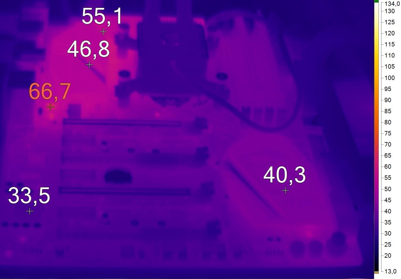В целом цепочка радиаторов хорошо справляется со своей задачей. Подсистема питания не перегревается, все температуры в норме.