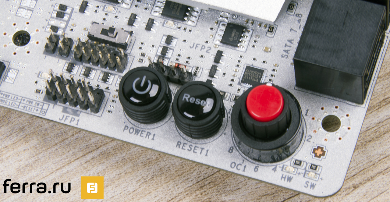 Так как TITANIUM EDITION в первую очередь выпущена для оверклокеров, то всевозможных «фишек» у этой платы — хоть отбавляй. На текстолите распаяно множество органов управления и всевозможных тумблеров: от примитивных кнопок включения/выключения и перезагрузки системы до точек замера основных напряжений. Все эти «вертелки» есть у MSI Z170A GAMING M9 ACK.