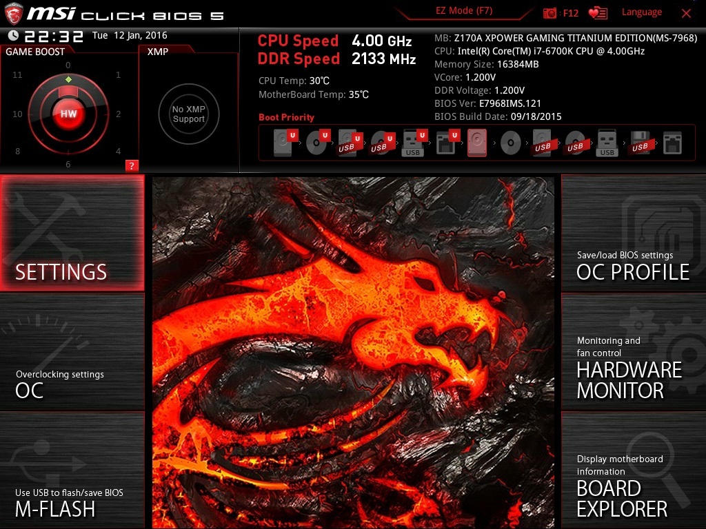 Основа TITANIUM EDITION — прошивка Click BIOS 5. Точно такая же система используется в материнских платах MSI Z170A GAMING M9 ACK и MSI Z170A GAMING M7. В плане функциональности никаких отличий нет. Используется все тот же агрессивный красно-черный скин.