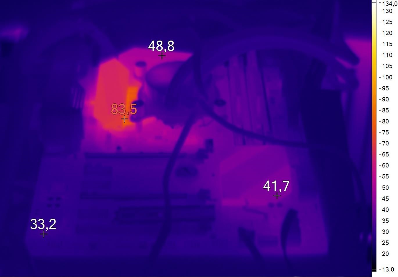 Подсистема питания Z270 GAMING PRO CARBON заметно греется. Но до критичных температур дело не доходит. Плюс не забываем, что процессор разогнан до 5000 МГц, а это большая нагрузка для имеющихся элементов. К тому же в стенде использовалась СВО. С воздушным кулером в качественном корпусе температура подсистемы питания будет ниже.