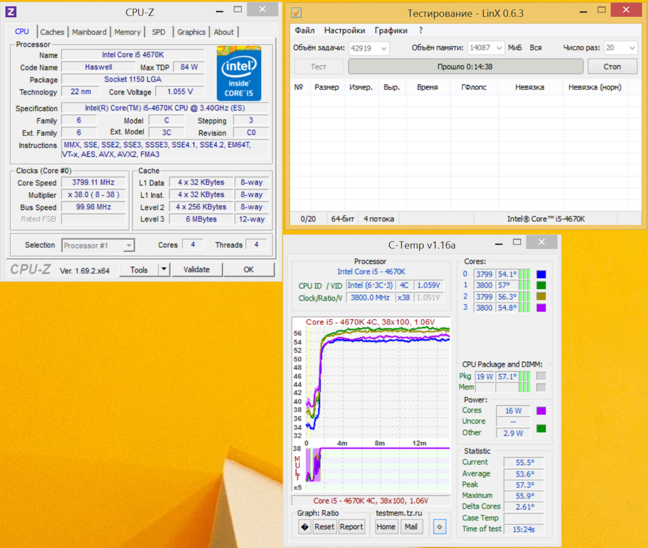Начнем с анализа результатов Core i5-4670K и Core i5-4690K. Как видите, при дефолтных параметрах Devil’s Canyon оказался более холодным: 55,3 градуса Цельсия против 57,3 градусов Цельсия. И это при том, что Core i5-4690K работает на большей частоте.