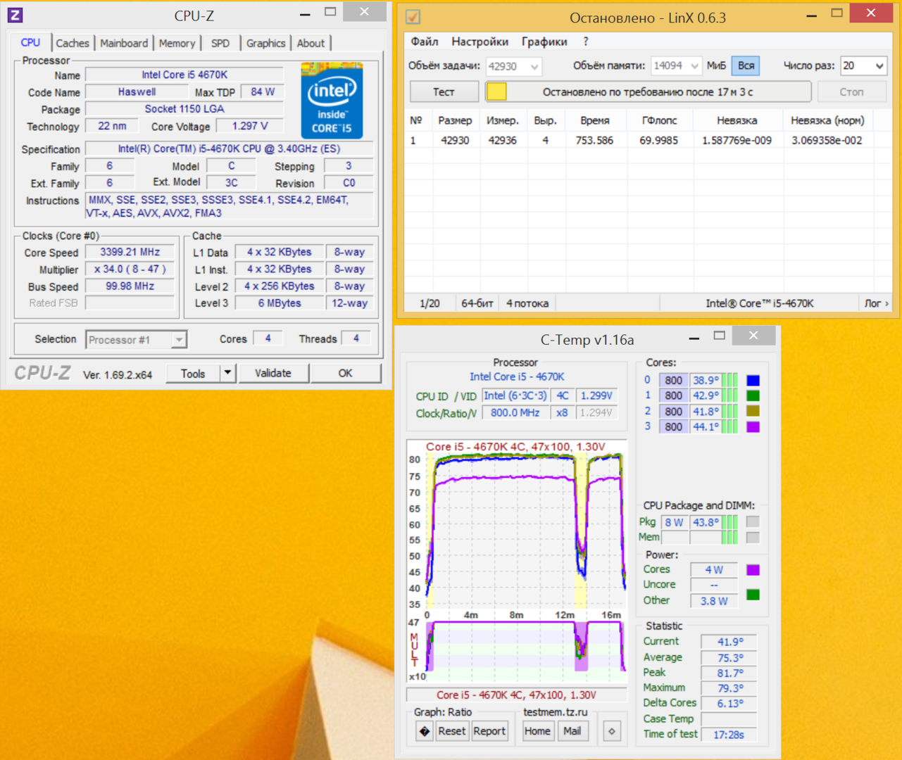 А вот Core i7-4790K несказанно порадовал! Он легко запустился при заданных настройках. И был намного холоднее Core i7-4770K. Если «прошлогодний» Haswell прогрелся до 94,5 градусов Цельсия, то Devil’s Canyon — всего до 79,7 градусов Цельсия. Отличный результат!