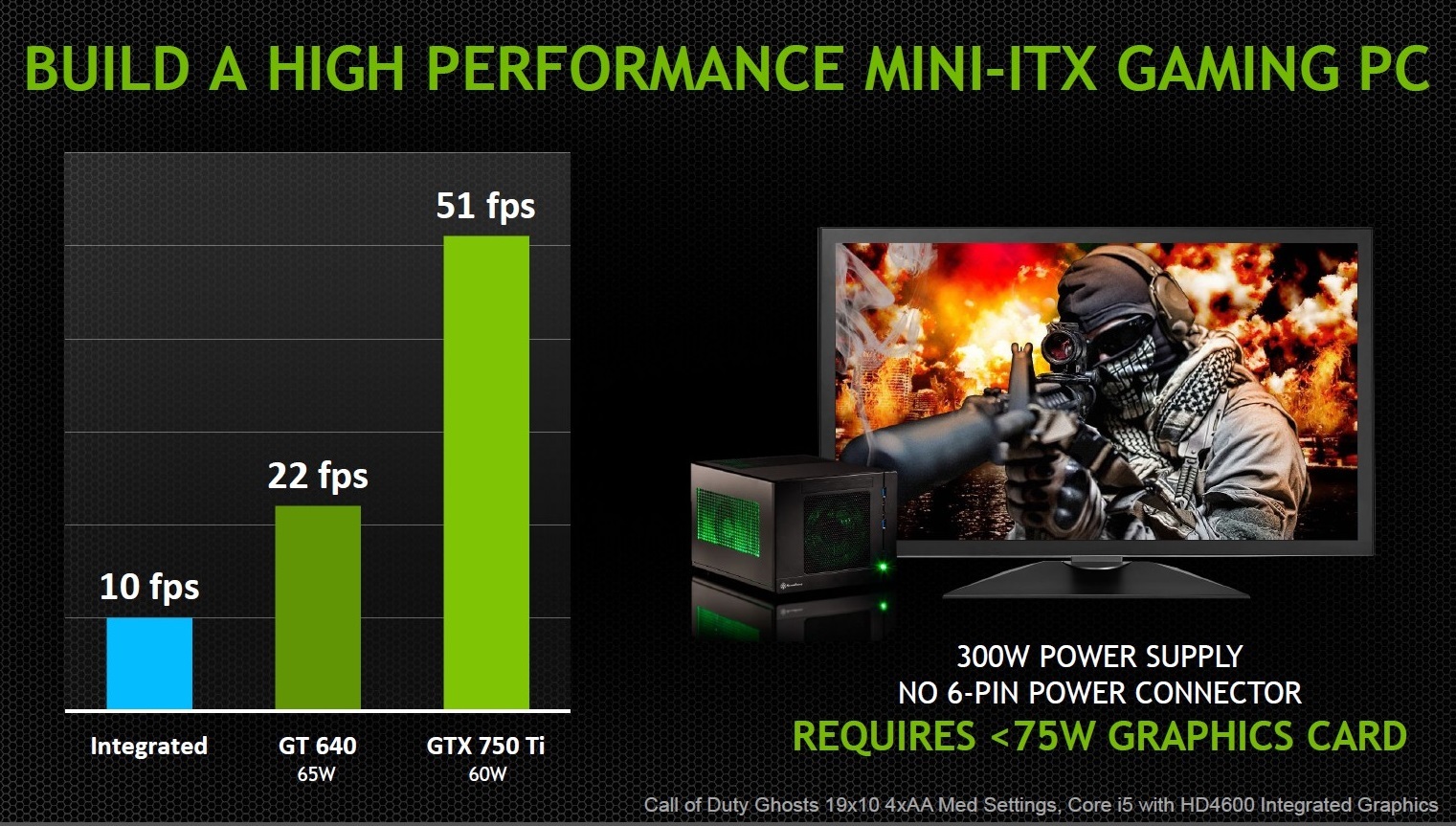 Отсутствие дополнительного питания у GeForce GTX 750 и GeForce GTX 750 Ti — это очень важный (по мнению NVIDIA) момент. Данный плюс позволяет интегрировать новые видеокарты в маломощные системы: HTPC или игровые компьютеры на основе материнских плат форм-фактора Mini-ITX. Стоит упомянуть и про консоль для гостиной Steam Machine, ведь для игровой приставки показатель энергопотребления очень важен.