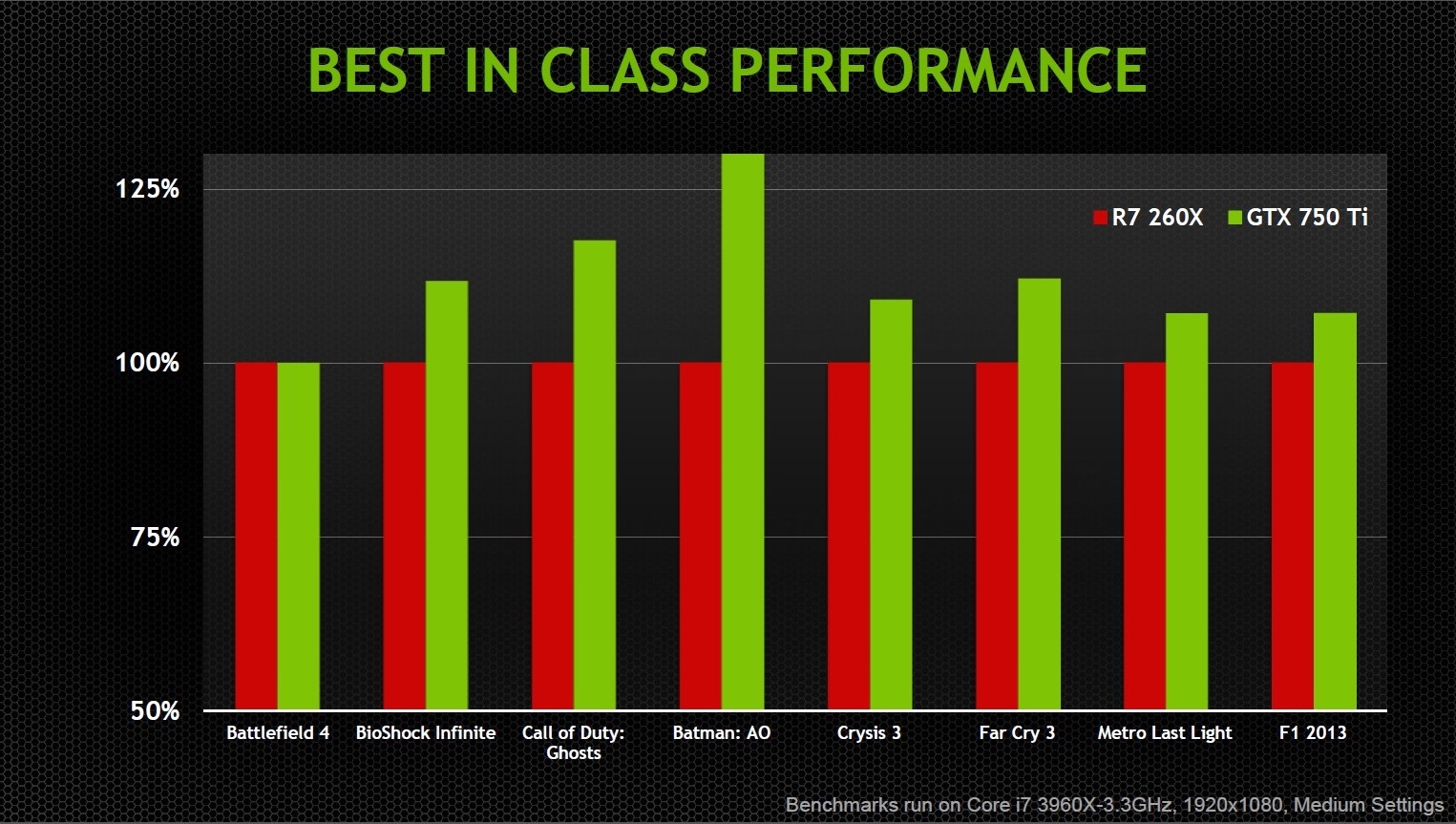 Для начала предлагаем ознакомиться с результатами тестирования, которые предоставила сама NVIDIA. Легко заметить, что во всех предоставленных играх и бенчмарках GeForce GTX 750 Ti успешно опережает главного конкурента — Radeon R7 260X.