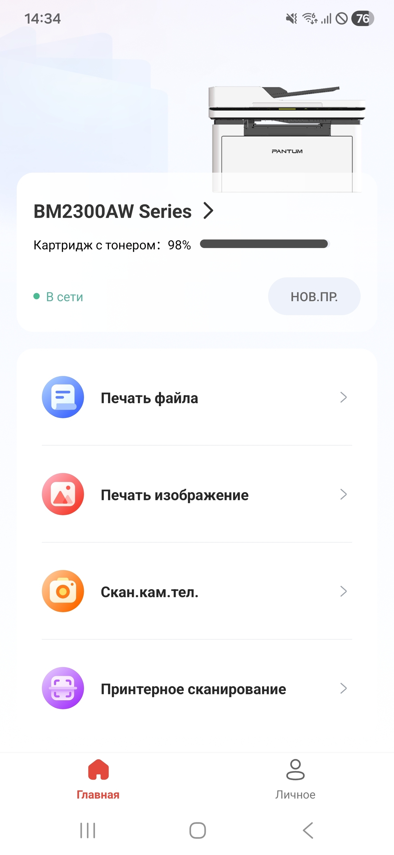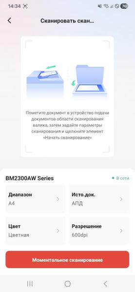 У Pantum есть приложение для смартфона, в котором можно управлять основными функциями: печатать документы из разных источников, сканировать. Доступен даже сканер документов на сам телефон! Зачем? Видимо, для удобства, чтобы вы не переключались между несколькими приложениями. Эта функция довольно криво определяет границы документа, так что Microsoft Lens будет получше. Тем более, документ всё равно сканируется как фото в память телефона, а не сразу идёт на печать.