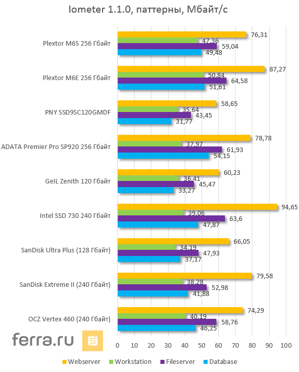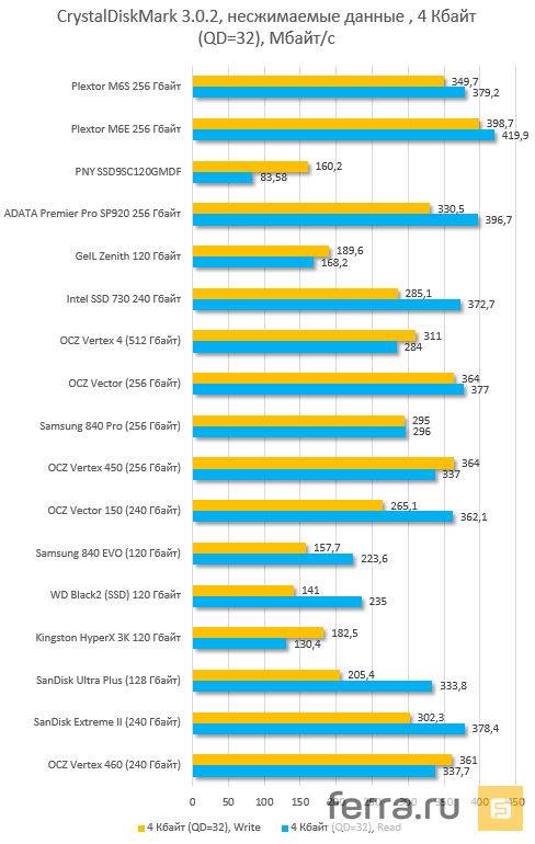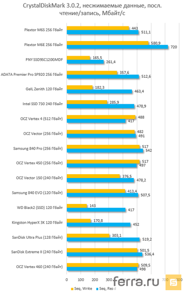 | Plextor M6e 256 Гбайт (PX-AG256M6e) | Samsung 840 Pro 256 Гбайт | Plextor M6s 256 Гбайт (PX-256M6s) | SanDisk Extreme II 240 Гбайт | |