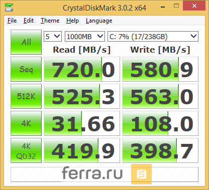 Максимальная скорость Plextor M6e в ATTO Disk Benchmark составила 730 Мбайт/с в режиме чтения и 587 Мбайт/с в режиме записи. Расхождение первой цифры с заявленными характеристиками легко объяснимо: производительность шины PCI Express может заметно варьироваться в зависимости от модели материнской платы. Но даже имеющиеся цифры демонстрируют ощутимый прирост производительности в сравнении с аналогичными накопителями под управлением SATA 3.0.
