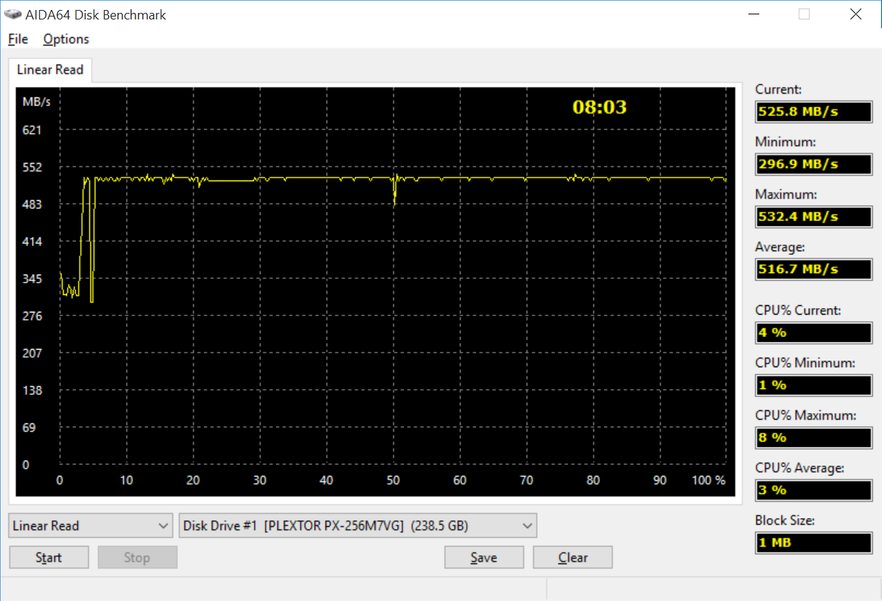 Второй интересный момент работы накопителей касается линейного чтения. В бенчмарке ATTO мы уже столкнулись с нелогичными просадками на блоках большого объема. Судя по графику AIDA64, накопителям требуется определенное время для разгона, так как при чтении видны колебания с просадками до 260 Мбайт/с. После 5% чтения M7V выходят на стабильное быстродействие 500+ Мбайт/с. Аналогичное поведение наблюдается на обоих устройствах во всех бенчмарках. Тенденция, однако.