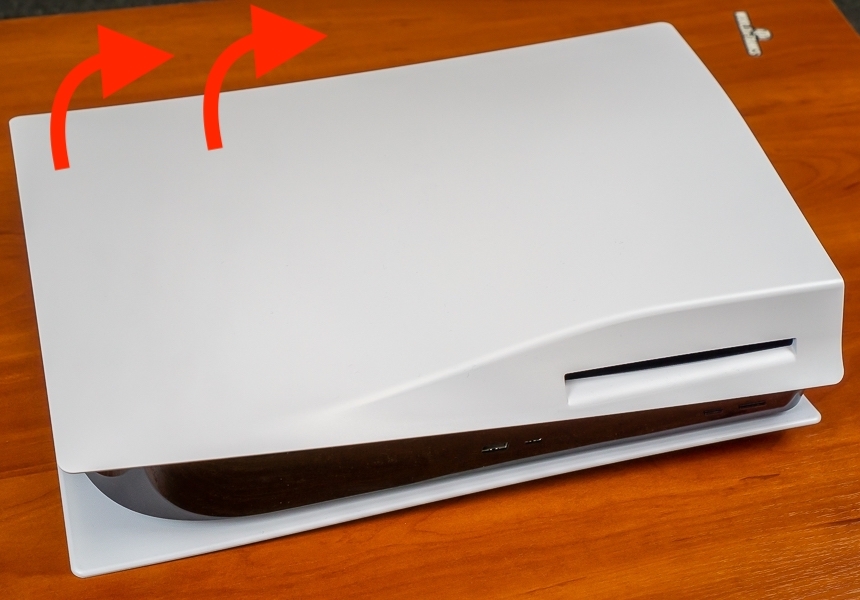 Теперь нужно снять крышку. Она снимается без участия отвёртки, но нужно приложить немного силы. Приподнимите части крышки со стороны задних портов и в верхней части консоли, и потяните крышку к нижней части консоли (в ту сторону, где была подставка для вертикальной установки).