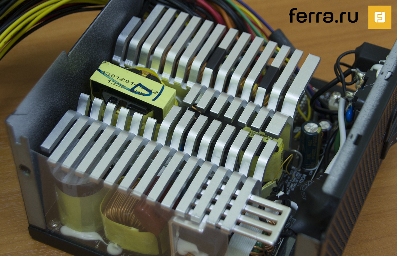 «Внутренности» блока собраны достаточно аккуратно. Большая часть элементов не видна из-за трех алюминиевых радиаторов. Две большие металлические конструкции предназначены для охлаждения силовых транзисторов.