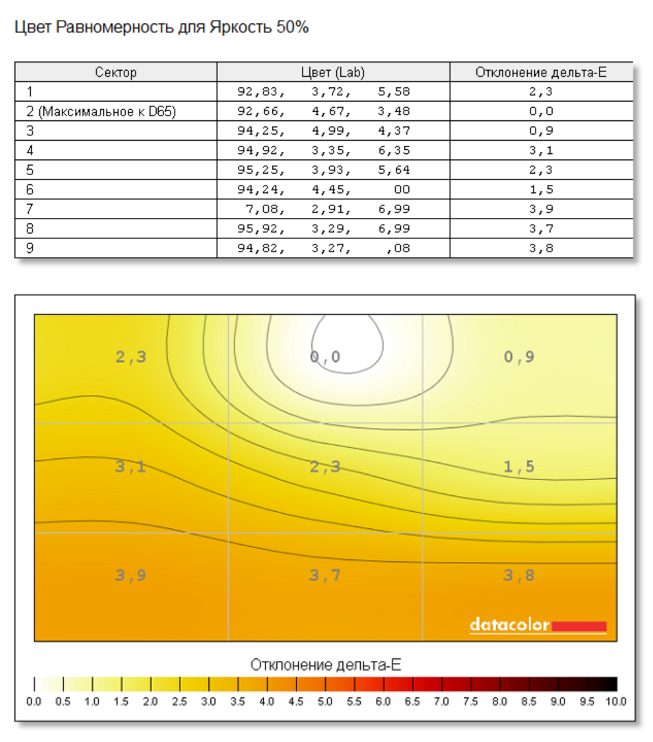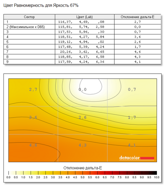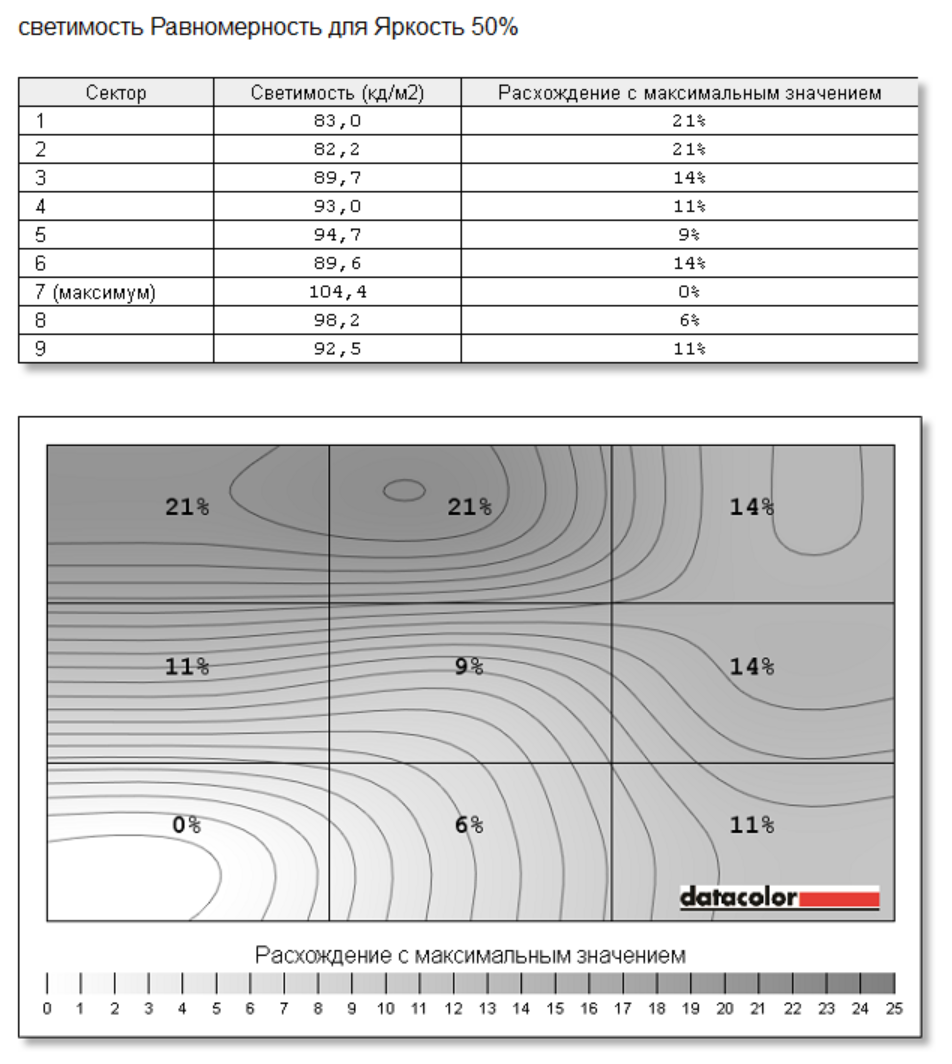 Равномерность цвета средняя, хотелось бы лучшего результата. Верхняя центральная часть экрана по равномерности заметно отличается от нижней части и левого угла на низких значениях яркости. На высокой яркости ситуация меняется на противоположную. Присутствуют также отклонения светимости, блуждающие по экрану на разных уровнях яркости.