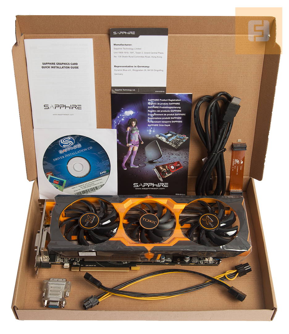 В небольшой черно-оранжевой коробке, помимо самой видеокарты, находится стандартный комплект, состоящий из диска с программным обеспечением, набора кабелей для блока питания, переходника DVI-to-VGA и мостика CrossFire.