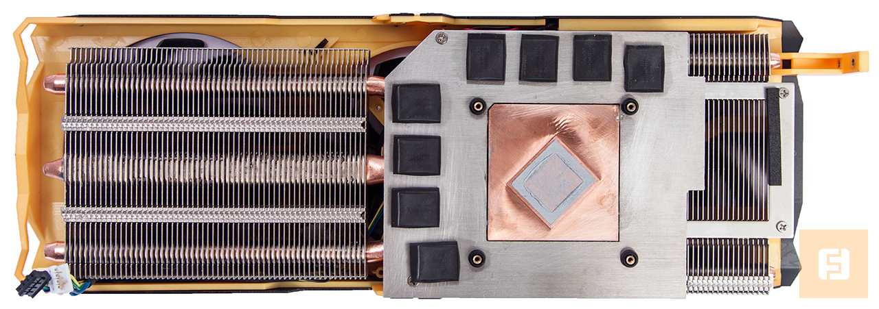 Тепло от GPU и памяти у Vapor-X R9 270X отводится при помощи алюминиевой пластины с медным основанием в центре. Однако в конструкции кулера используется всего четыре теплотрубки. С основанием радиатора соприкасаются и компоненты цепи питания. В радиатор встроена испарительная камера. Именно поэтому видеокарта получила название Vapor-X. Испарительная камера позволяет значительно снизить уровень шума кулера.