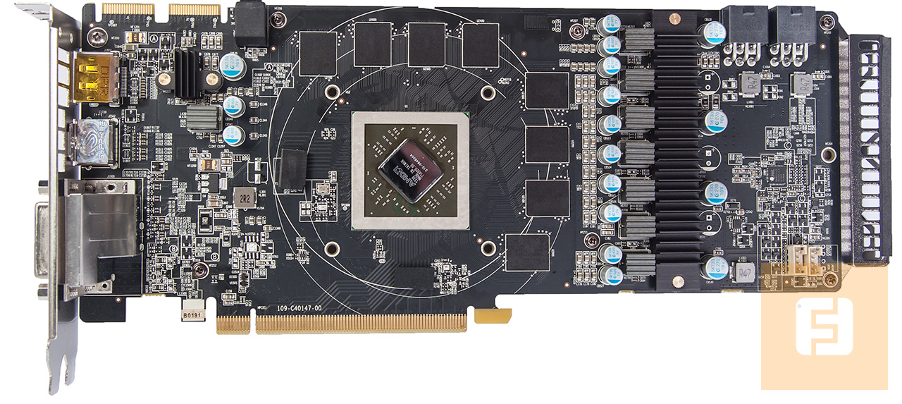 Сняв радиатор, получаем доступ к печатной плате. У Toxic R9 270X в наличии 8-фазная подсистема питания с собственными радиаторами охлаждения. Вокруг GPU распаяно восемь чипов памяти.
