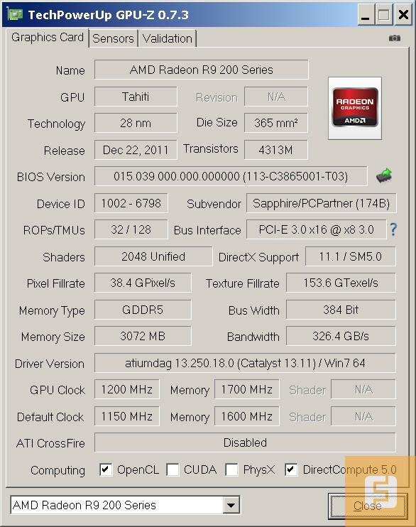 Тестирование было проведено в двух режимах: на дефолтных частотах чипа и памяти, а также после разгона. В номинальном режиме показатели Toxic R9 280X составляют 1150 МГц по чипу и 1600 (6400) МГц по памяти. После разгона была зафиксирована стабильная частота 1200 МГц по чипу и 1700 (6800) МГц по памяти.