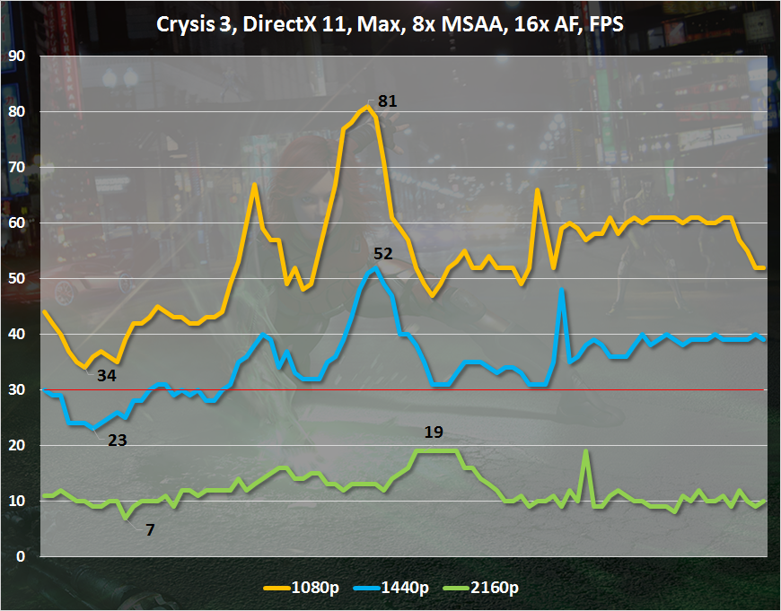 Что повлияло на результаты в Crysis 3: недостаточный объем видеопамяти и нехватка силенок у GPU? После снижения антиалиазинга до 2-кратного показателя уровень FPS в 1440p увеличился в среднем на 10 кадров в секунду. Но в 4K-разрешении производительности графического процессора Fiji PRO все равно недостаточно.