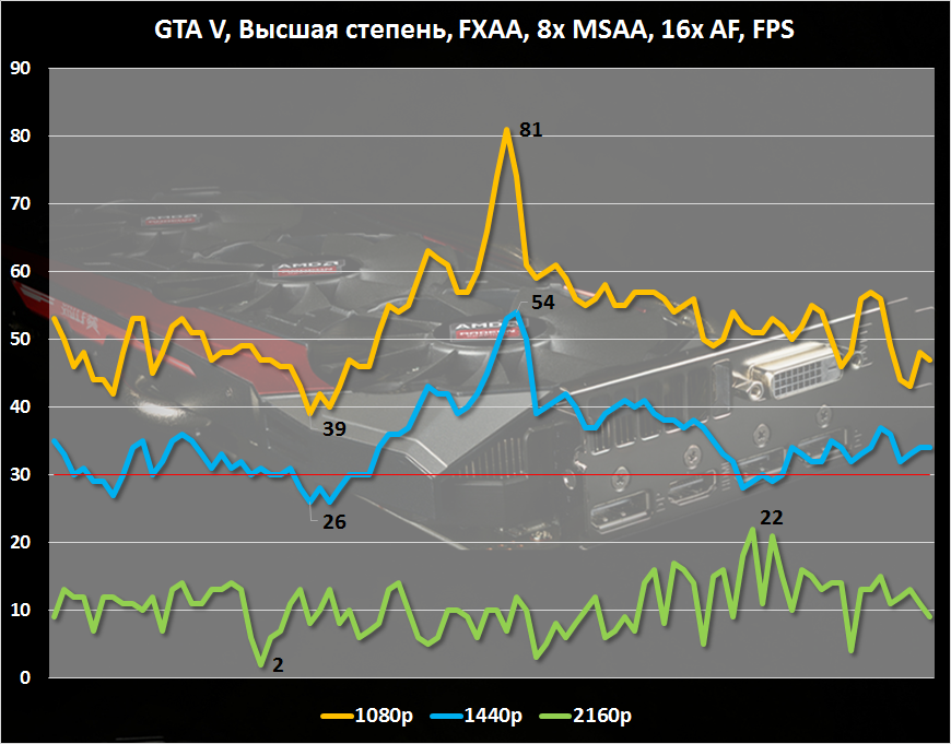 В GTA V при максимальном качестве графики и 8-кратном сглаживании уже в разрешении Full HD задействуется свыше 3 Гбайт памяти. Поэтому разрешения WQHD и Ultra HD даются TRI-X R9 Fury тяжеловато. Стоит уменьшить параметр антиалиазинга, выдержав в одночасье лимит в 4 Гбайт видеопамяти, как условно комфортный уровень FPS был достигнут даже в 4K.