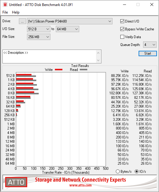 ATTO – это простой замер характеристик SSD в самых «тепличных» условиях при последовательной записи (как если бы вы копировали файлы с одного SSD на другой целой папкой в Windows). Обычно цифры, которые производители указывают на упаковке, берутся именно из результатов этого бенчмарка. Ну и ещё его все любят за то, что в нём удобно поглядывать, как изменяется скорость работы SSD в зависимости от того, насколько крупные файлы вы будете перебрасывать.