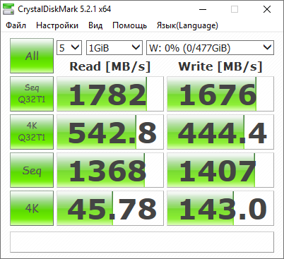 Все замеры мы проводили на компьютере с 64-битной “Windows 10 Домашней” версии 17.763, которая адекватно работает с новыми NVMe-SSD. И, не забывайте, из-за сраных округлений в файловых системах, как и в случае с любыми другими жёсткими дисками/SSD/флешками вы получаете меньше гигабайт, чем заявлено на этикетке. В нашем случае – 476,9 Гбайт. Сейчас проверим, насколько быстрых гигабайт.