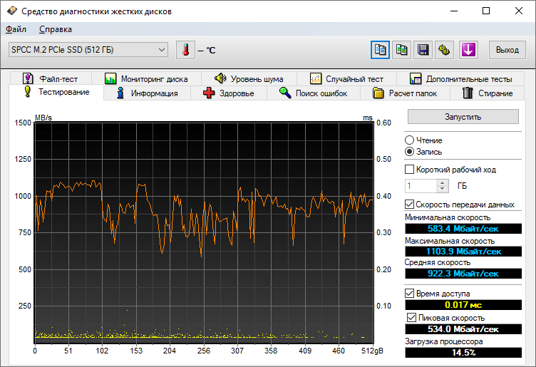 Бенчмарк HD Tune Pro, как обычно, скептичен больше прочих и показывает приземленные скоростные значения. После нескольких прогонов, максимальный результат по скорости чтения и записи составили 1192,7 Мбайт/с и 1103,9 Мбайт/с соответственно. И это на первом прогоне. При дальнейшей нагрузке на накопитель пропускная способность стала чуть ниже и результаты упали до 1056,1 Мбайт/с при записи и 1148,2 Мбайт/с при чтении.