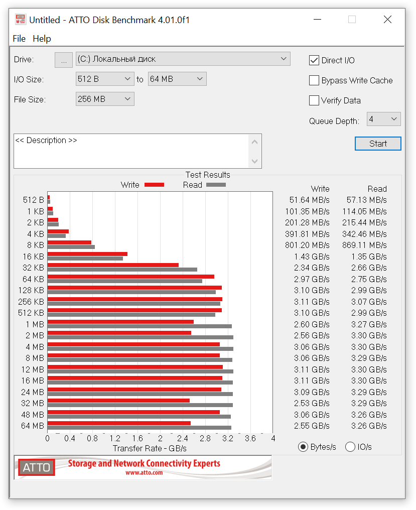 По закону повышения градуса первый тест будет на простом замере скоростей в ATTO — замер производительности чтения и записи в зависимости от размеров файлов.