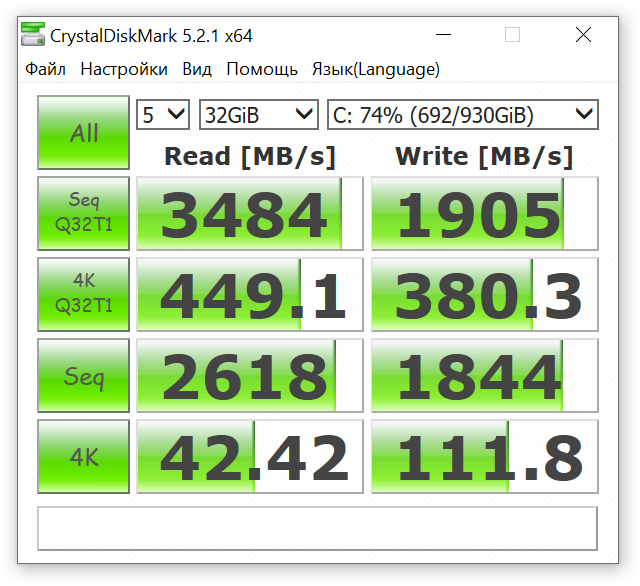 Условия тепличные, производительность классная — уже начиная с файлов объёмом 64 Кб SSD начинает работать на почти максимальной скорости. А на, так сказать, «полный форсаж» выходит уже на файлах от 1 Мб и крупнее. В общем-то, должен молотить бодро и служебные мелкие файлы Windows/программ, а уж с фотографиями или видео справляться на супер-скоростях — у вас такой скорости интернета или внешних флешек нет, чтобы раскрыть потенциал скорости подобного SSD на полную. Едем дальше.
