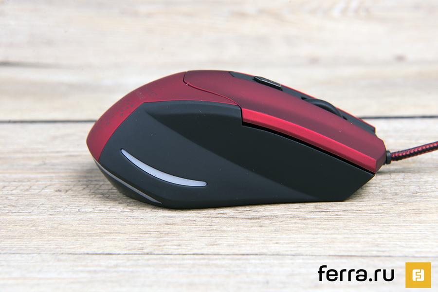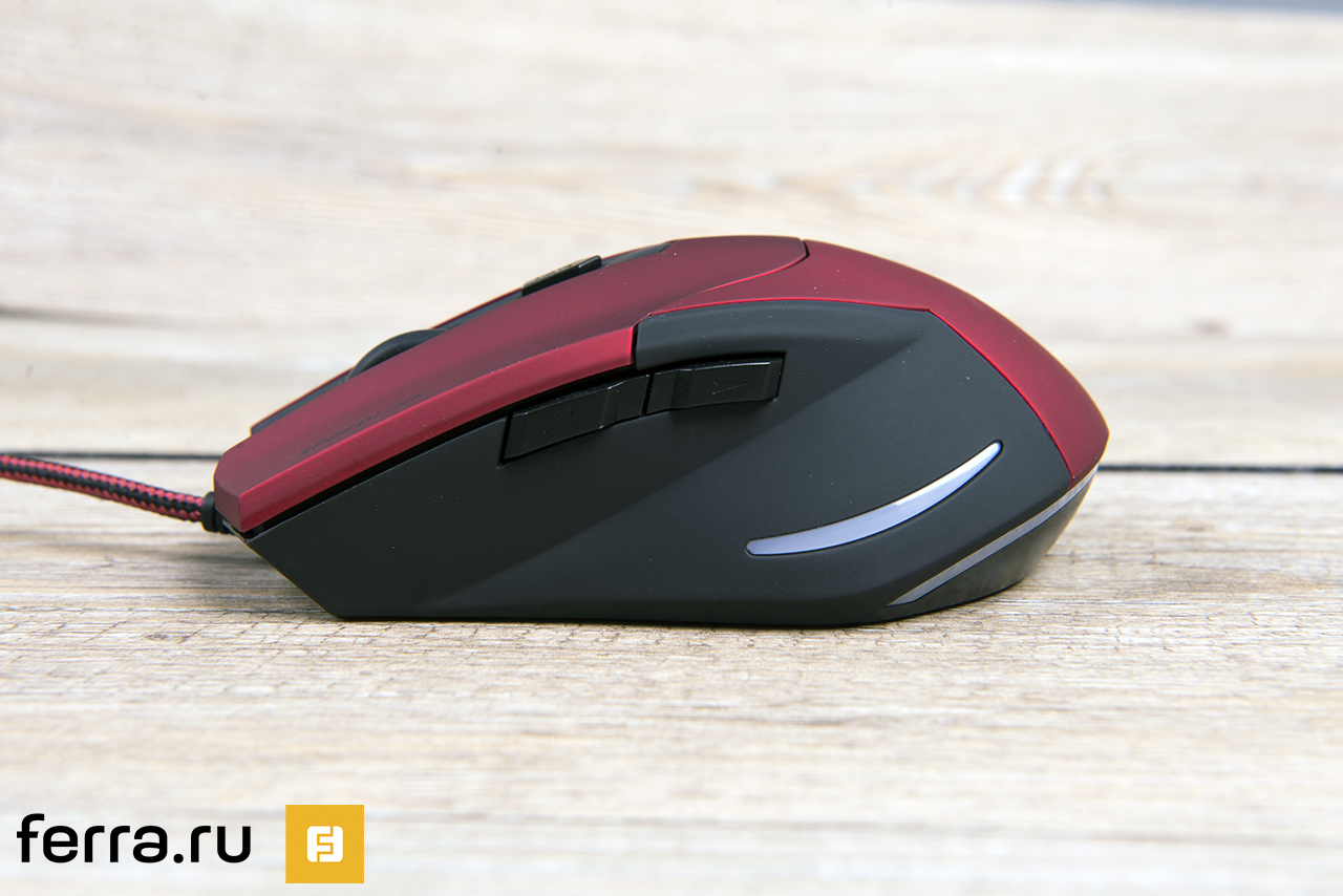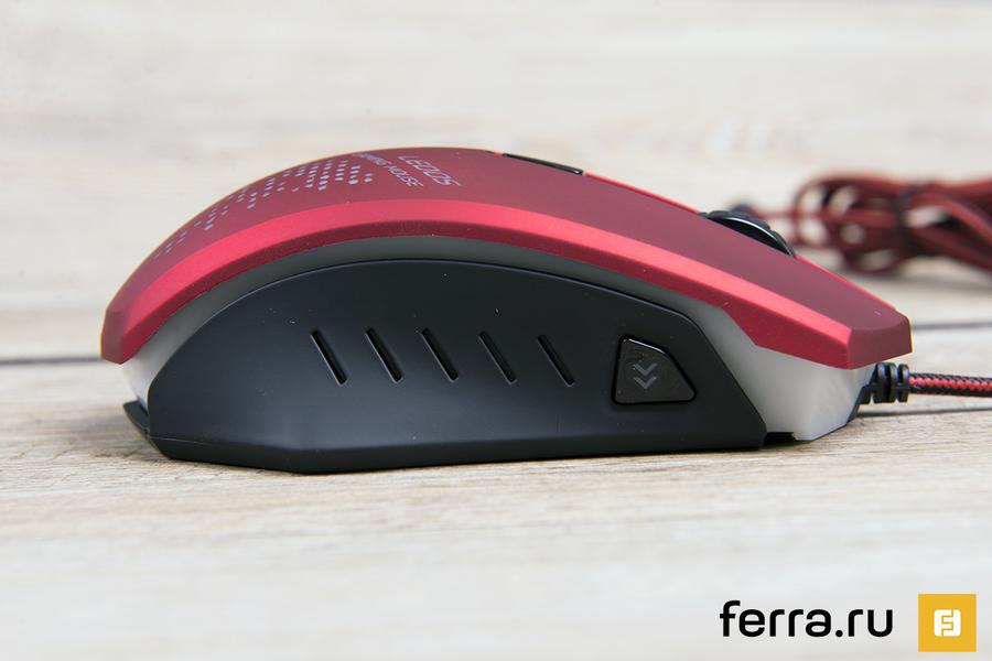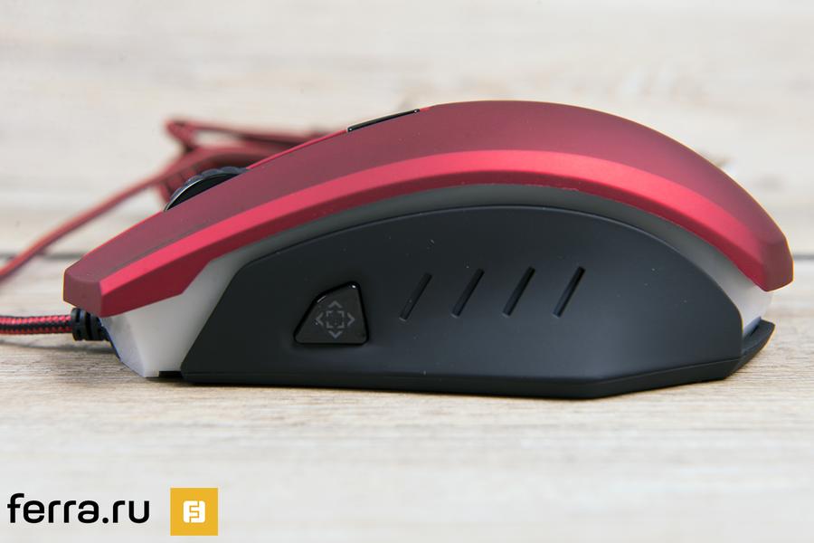 Основная фишка этой мышки — наличие по бокам двух специальных клавиш. Первая (слева) дублирует двойной клик левой кнопки мыши. Пригодится в шутерах и вообще там, где часто используется двойной клик. Вторая («кнопка снайпера», справа) снижает разрешение сенсора до 500 dpi. Чтобы лучше прицеливаться.