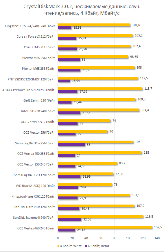 | Операций ввода-вывода, при произвольном чтении 4К | 72500 IOPS | 91000 IOPS | 85000 IOPS |