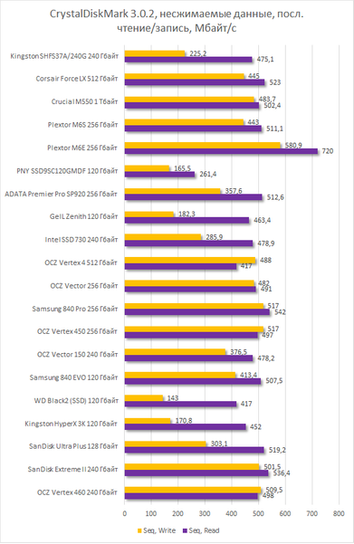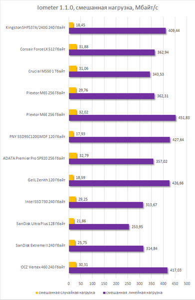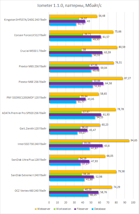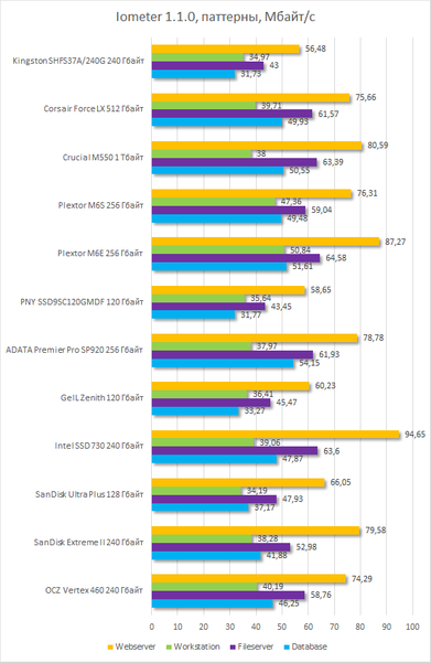 В остальных случаях Kingston конкурирует с бюджетными накопителями с 120 Гбайт на борту, изредка достигая средних результатов в нашей таблице. Примечательно, что производитель не скрывает реальных скоростных характеристик накопителя — заявленные 470 Мбайт/с в режиме чтения и 220 Мбайт/с в режиме записи несжимаемых данных легко воспроизводятся в тестовых условиях.
