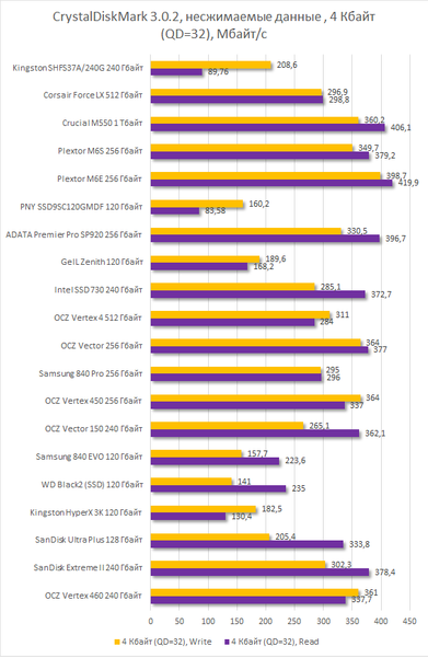 Случайные операции с мелкими файлами выглядят насмешкой применительно к серии HyperX — бюджетная NAND и специфика работы контроллера вносят свои коррективы. Использование большой глубины доступа для файлов размера 4K снижает скорость чтения практически до уровня жёстких дисков.