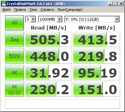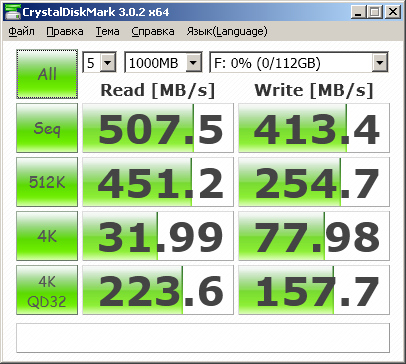 Результаты измерений в бенчмарке ATTO Disk Benchmark оказались довольно солидными: чтение — 553 Мбайт/с, запись — 416 Мбайт/с. Всё же не будем заострять на этом внимание, а обратимся к показаниям других тестов.