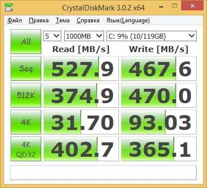 Исторически ATTO Benchmark оперирует лишь сжимаемыми данными. Такая методика позволяет «блеснуть» даже низкокачественным накопителям под управлением архаичного контроллера Sandforce SF-2281. Чтобы оценить производительность SSD более комплексно, мы обратились к тестовой утилите CrystalDiskMark.