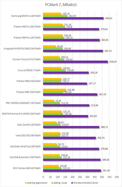 Потенциал SSD в бытовых условиях лучше всего раскрывает тест PCMark 7 и его реалистичные сценарии эксплуатации. Седьмая версия этого тестового пакета моделирует нагрузку в игровых приложениях, графических и текстовых редакторах, операциях с файлами и антивирусном ПО.