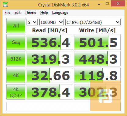 Результаты CrystalDiskMark подтверждают высокую скорость чтения у накопителя SanDisk, а скорость записи этой модели приближается к лучшим моделям на рынке. Правда, как только дело касается блока размеров 512 Кбайт, SSD ударяется в некоторую сумятицу, проседая ниже уровня Samsung 830. Тем не менее, суммарная производительность Extreme II довольно высока.