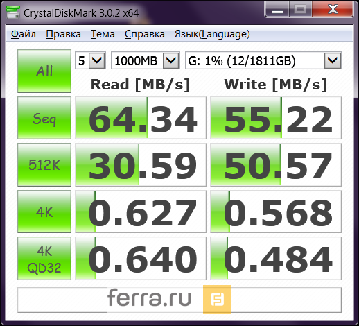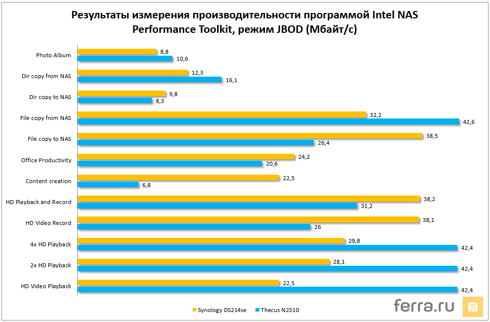 Измерения производительности осуществлялись с помощью программ Intel NAS Performance Toolkit и CrystalDiskMark. При этом компьютер был подключён напрямую к NAS через гигабитный сетевой интерфейс. Доступ к файловой системе сетевого хранилища осуществлялся по протоколу CIFS.