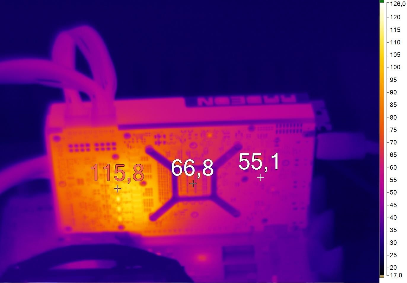 Как видите, система охлаждения хорошо справляется со своей работой. В качестве примера я привел термоснимок Radeon R9 Fury X. Да, у этой видеокарты необслуживаемая СВО эффективно охлаждает центральный процессор, однако все остальные элементы нехило греются. Подсистема питания раскаляется до 110-115 градусов Цельсия. На этом фоне Radeon R9 NANO выглядит очень холодной, что не может не радовать.