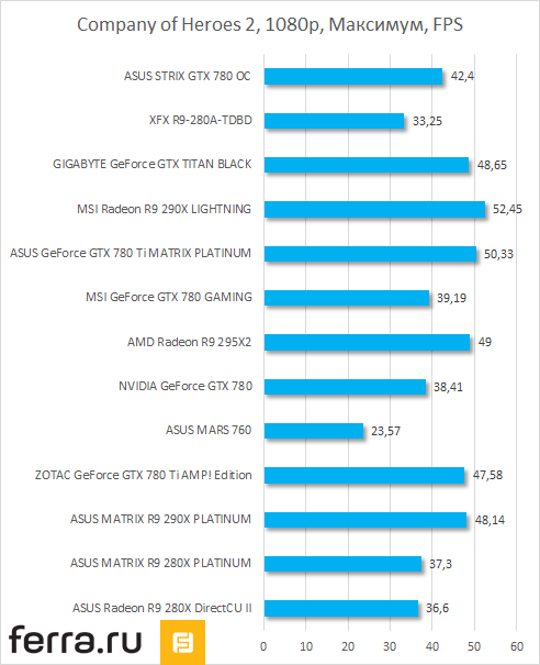 И пусть GeForce GTX 780 можно назвать «старой» видеокартой, но она отлично справляется с современными играми. В Full HD и WQHD. Лишь в Company of Heroes 2 и Metro: Last Light ASUS STRIX GeForce GTX 780 OC Edition не смогла перешагнуть ступеньку в 30 комфортных и средних FPS.