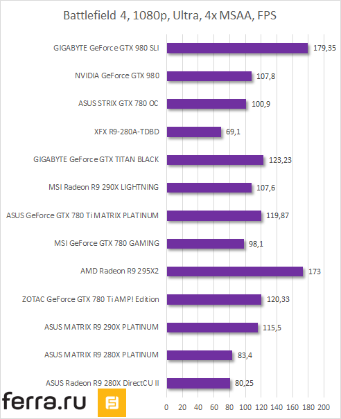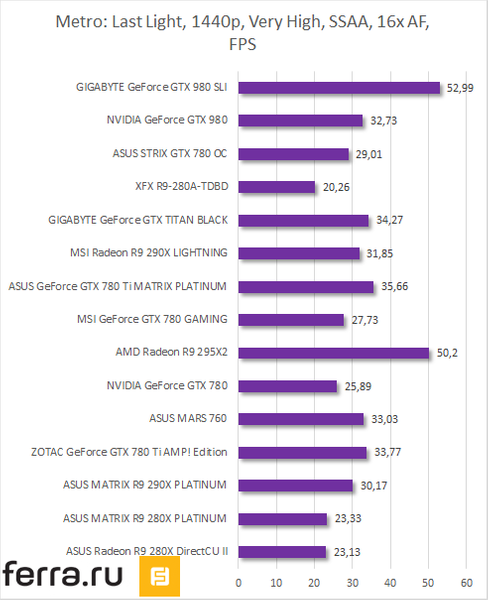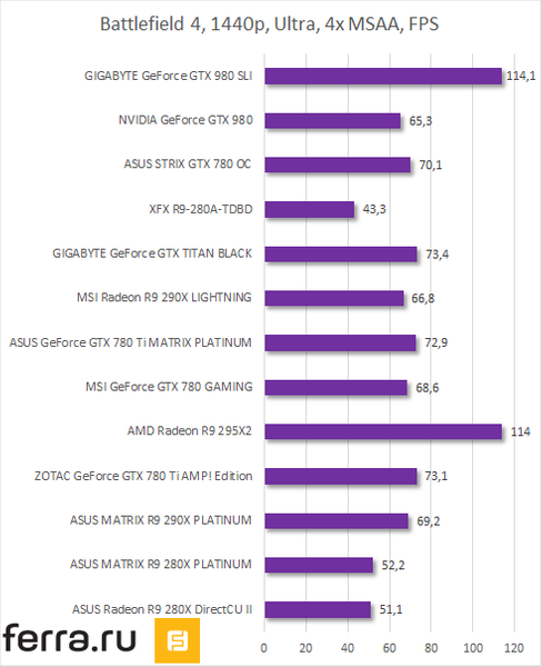 С использованием SLI теперь можно комфортно играть при разрешении WQHD. А вот в Ultra HD, увы, эффективность массива GeForce GTX 980 не позволяет говорить о достаточном уровне быстродействия.