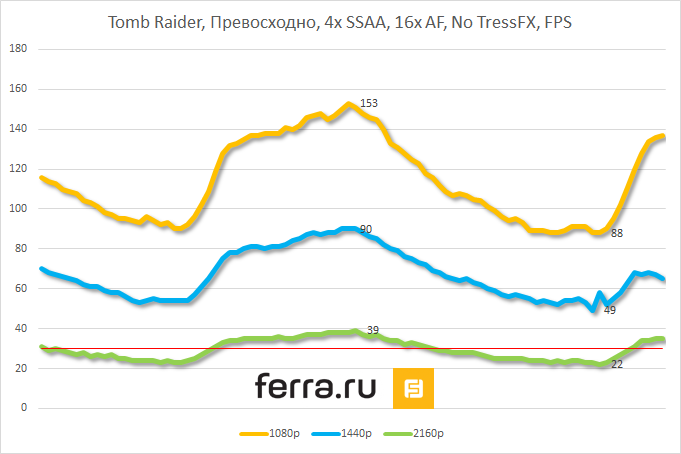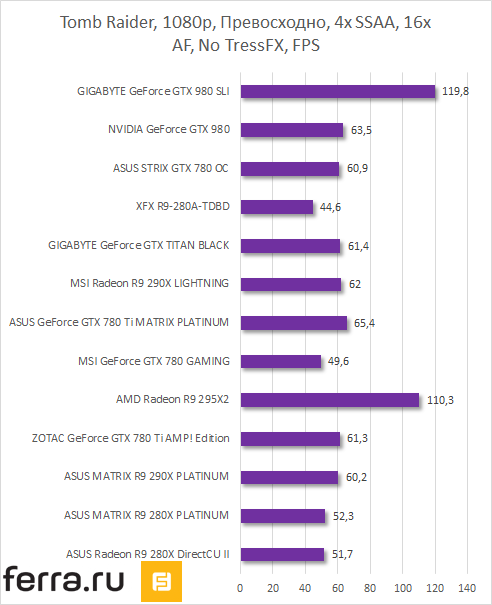 Видно, что Tomb Raider хорошо оптимизирован под SLI. Однако, как и в Metro: LL, в Ultra HD комфортного уровня кадрирования нет.
