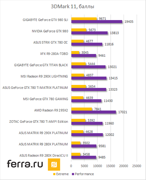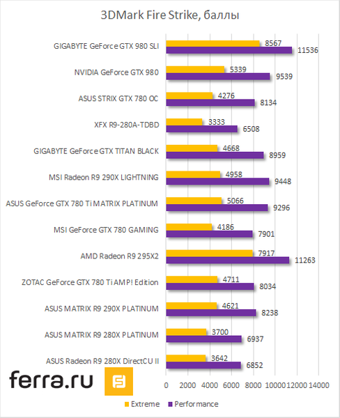 А теперь давайте посмотрим на производительность двух GeForce GTX 980 на фоне других видеокарт. Под графиками расположены таблицы, в которых в процентном соотношении отображена разница между одной GeForce GTX 980 и SLI-массивом. Начнем с синтетики.