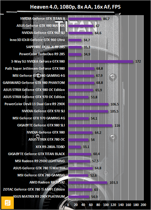Бенчмарк Heaven знаменателен тем, что обладает очень низкой процессорозависимостью. В тяжелых режимах так тем более. Давайте посчитаем, насколько GeForce GTX TITAN X быстрее ASUS GeForce GTX 980 MATRIX PLATINUM и референсной версии GeForce GTX 980: