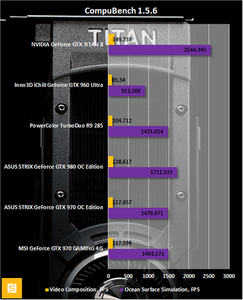 - В тесте Ocean Surface Simulation видеокарта GeForce GTX TITAN X быстрее GeForce GTX 980 на 48,6%.