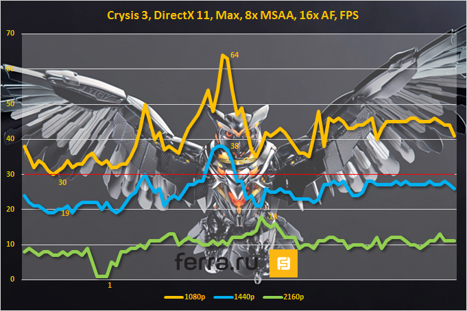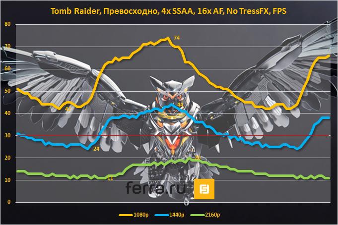 - Гейминг в Ultra HD — неудовлетворительно. Между результатами в 4К-разрешении и WQHD-разрешении расположилась целая пропасть. В данных условиях производительность видеокарты очень сильно просела.