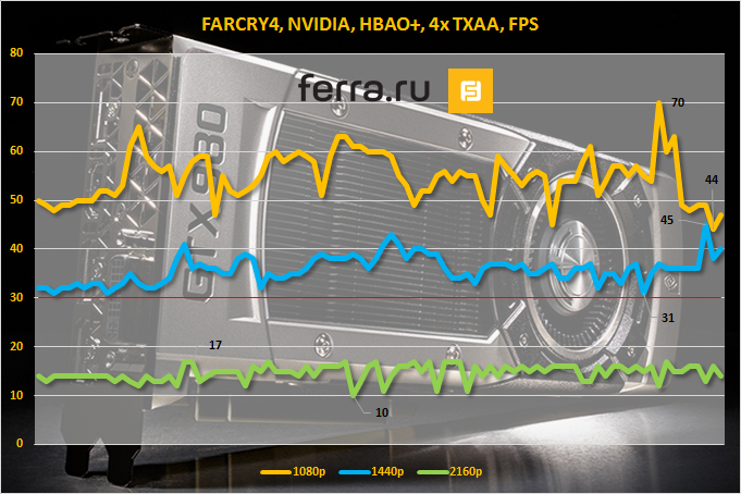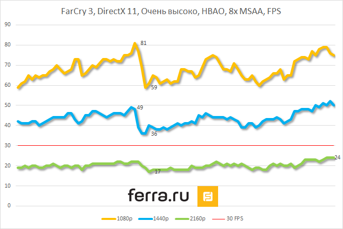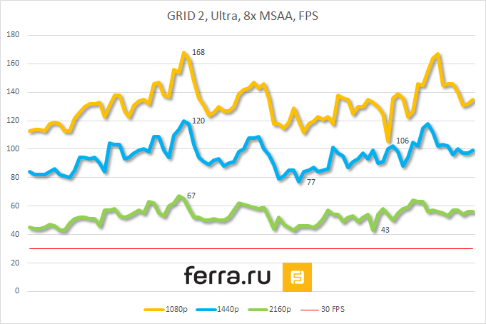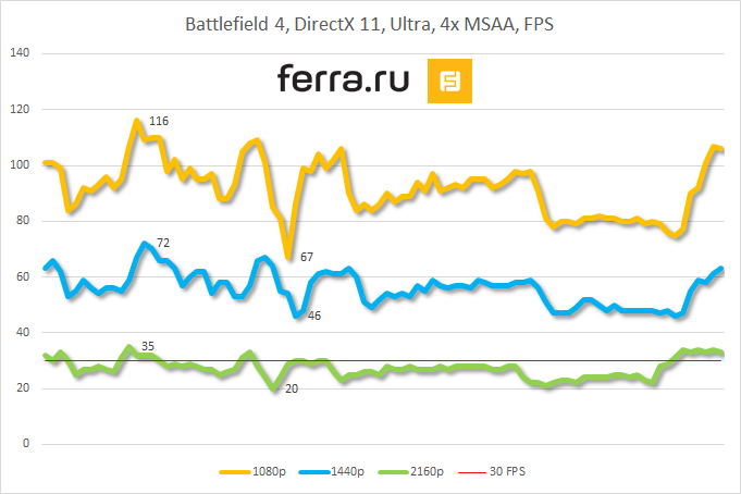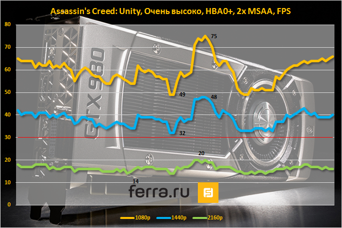 Как всегда, изучать производительность видеокарт я начну с анализа уровня FPS. Для этого я взял несколько популярных современных игр, которые имеют достаточно высокую ресурсоемкость. Были выбраны наиболее тяжелые сцены, тестирование производилось в трех разрешениях: мейнстримовом 1920х1080 (Full HD), расширенном 2560х1440 (WQHD) и сверхтяжелом 3840х2160 (Ultra HD). На графиках ниже на протяжении определенного отрезка времени показан ежесекундный уровень FPS. Минимальное и максимальное значения выделены отдельно. По среднему FPS будет проводиться сравнение с остальными видеокартами. Допустимым уровнем комфортного времяпрепровождения будем считать показатель 30 FPS. Отдельное внимание в данной статье уделено новинкам Ubisoft: Assassin’s Creed: Unity и Far Cry 4.