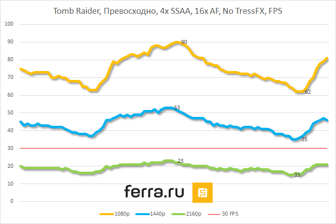 Первое серьезное испытание для 3-Way SLI. При заданных нами настройках дуэт GeForce GTX 980, как видно из графика, не справился с игрой в 4K-разрешении. А вот три графических адаптера наконец-то выдали заветные 30 FPS!