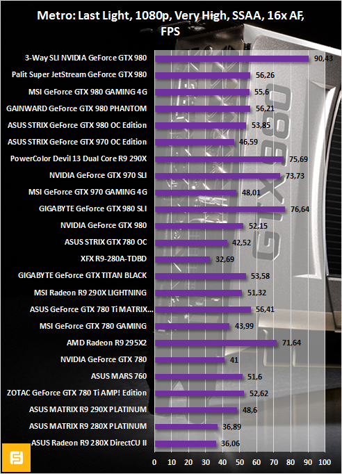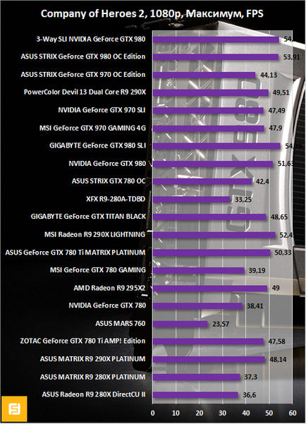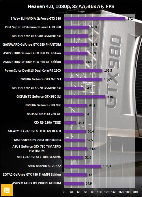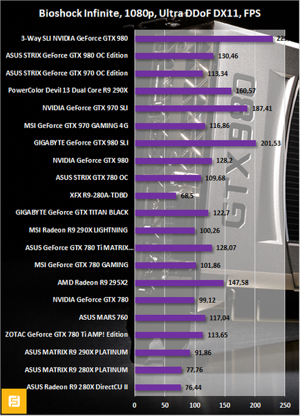 В данном параграфе приведены сравнительные графики в популярных играх и бенчмарках. Основная цель — постараться определить эффективность работы технологии 3-Way SLI. Для наглядности после каждой пачки графиков идет таблица с численным показателем разницы FPS по отношению к быстродействию одной GeForce GTX 980.
