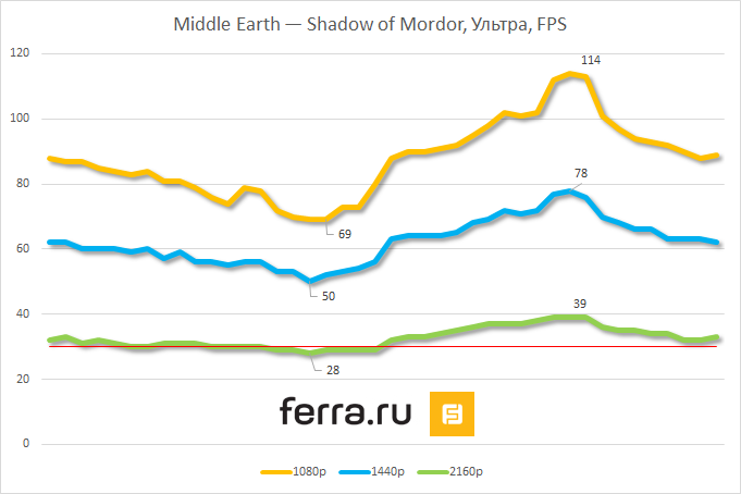 Познакомимся с уровнем производительности новинки — игры «Средиземье: Тени Мордора». Она неплохо оптимизирована под SLI и 3-Way SLI. Однако игра не ставит серьезных задач перед GeForce GTX 980. Даже одна видеокарта выдает в 4K-разрешении при максимальных настройках качества графики условно играбельную частоту кадров.
