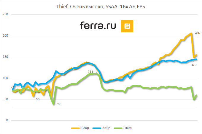 В Thief есть встроенный бенчмарк. И он немного странноватый. А именно в начале заскриптованной сцены во всех разрешениях наблюдается просадка FPS. Затем бенчмарк как бы раскочегаривается, и частота кадров начинает уверенно ползти вверх. В сравнении с SLI массив из трех видеокарт демонстрирует больше кадров в секунду. Однако в Full HD и WQHD опять происходит наслоение линий друг на друга. Ресурсоемкость у Thief не столь высока. Даже в Ultra HD наблюдается очень высокий уровень FPS.